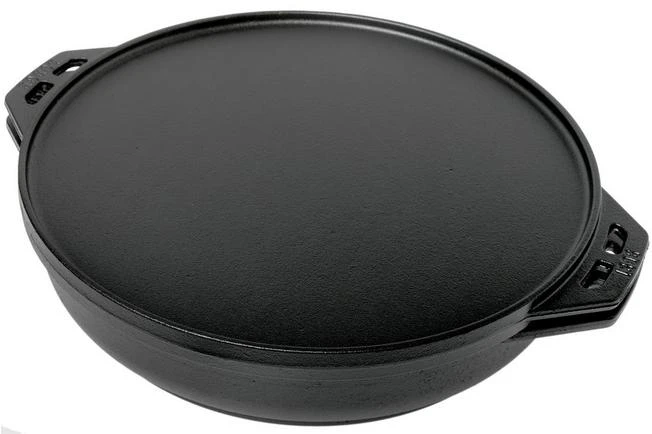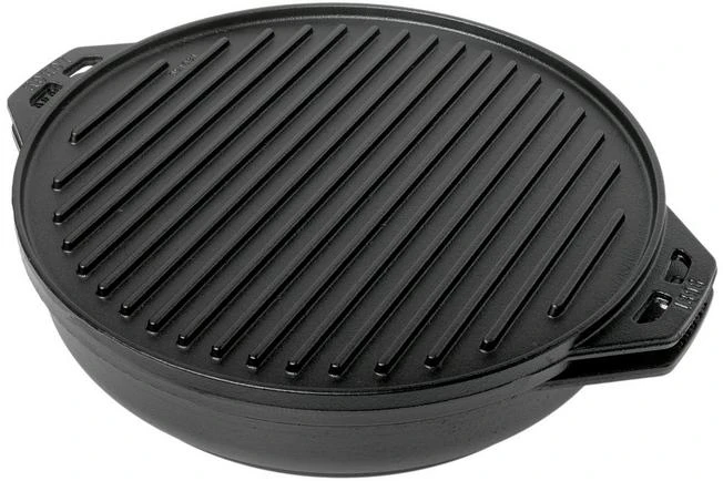 The Lodge Cook It All cooking set is the only outdoor cooking set you will ever need! The set is comprised of a grill/baking tray, a wok/frying pan, and two handles that stay cool. But with these two cast iron pans you can cook in no less than five different ways. Grill a perfect piece of meat on the grill, or turn it over and use it as a baking tray. Use it, for instance, to prepare the most delicious pizza. The wok/frying pan with a content of almost 6.5 litres is great when making chili. You can also use it as a lid for the grill or baking tray. You can do much more with this set; read all about it in the included manual. The manual contains all the tips & tricks.
